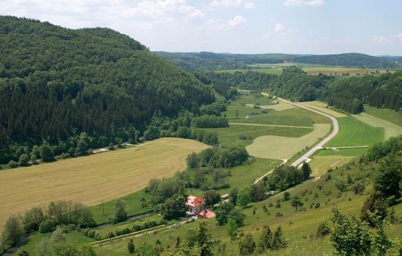 Am Ende des Waldes haben Sie einen wunderschönen Blick auf die südliche Schwäbische Alb bis zum Bussen, dem heiligen Berg Oberschwabens. Bei guter Fernsicht sind die Alpen zu sehen. Durch das Lüssental gehen Sie leicht bergab bis nach Buttenhausen. (B) In Buttenhausen angekommen, gehen Sie bis zur Rossbachquelle mit einer Hinweistafel, die auf den geschichtlichen Rundgang in Buttenhausen hinweist. Gegenüber der Einmündung der Wasserstetter Straße in die Heimtalstraße steht ein Mahnmal für die aus Buttenhausen vertriebenen und ermordeten Juden. Auf der Zwiefalter Straße gehen Sie bis zur Bernheimer’schen Realschule, in der sich das Jüdische Museum befindet. Zur Matthias Erzberger- Gedenkstätte, die in Erzbergers Geburthaus eingerichtet ist, dem Platz